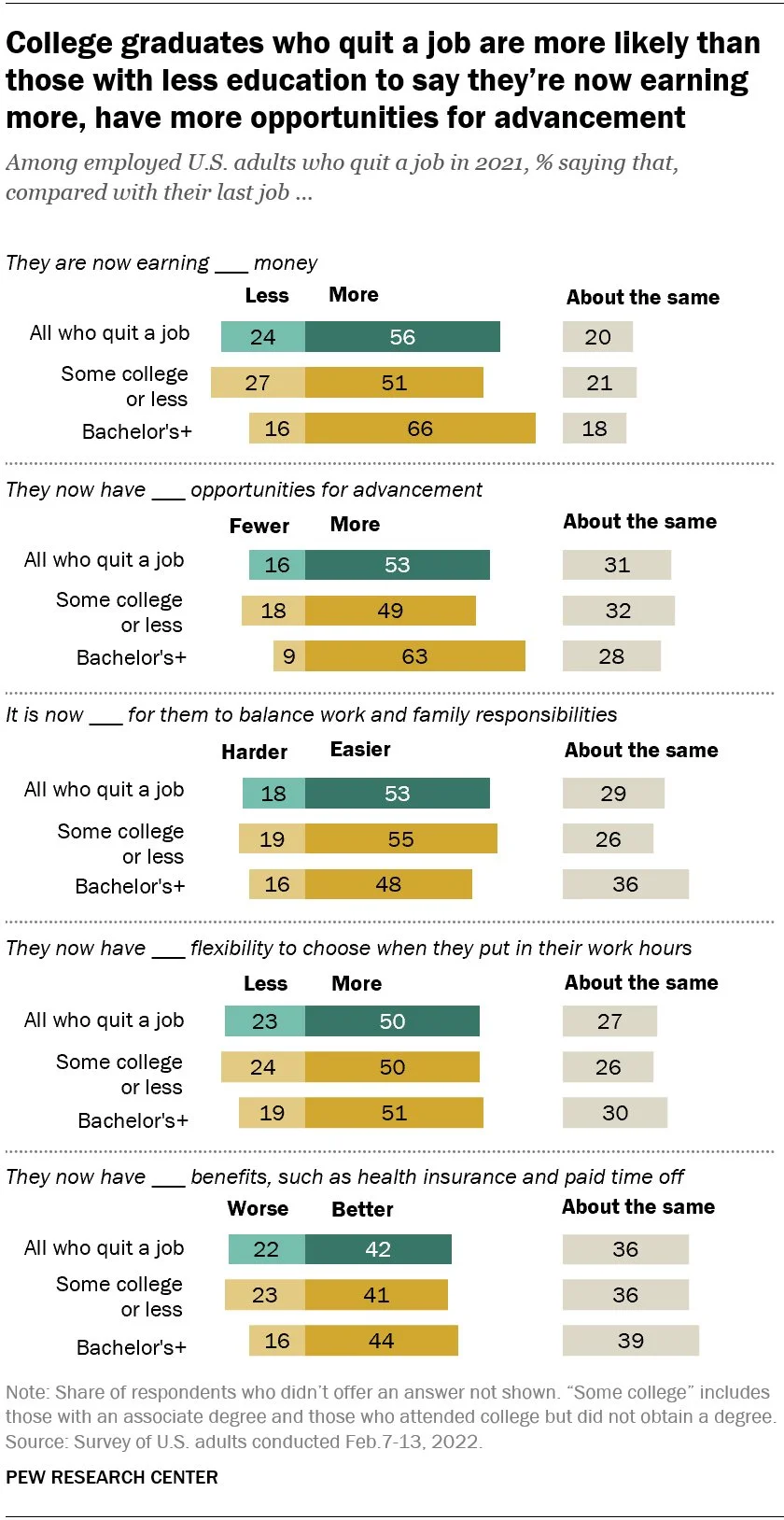 College graduates are more likely than those with less education to say that compared with their last job, they are now earning more (66% vs. 51%) and have more opportunities for advancement (63% vs. 49%). In turn, those with less education are more likely than college graduates to say they are earning less in their current job (27% vs. 16%) and that they have fewer opportunities for advancement (18% vs. 9%).